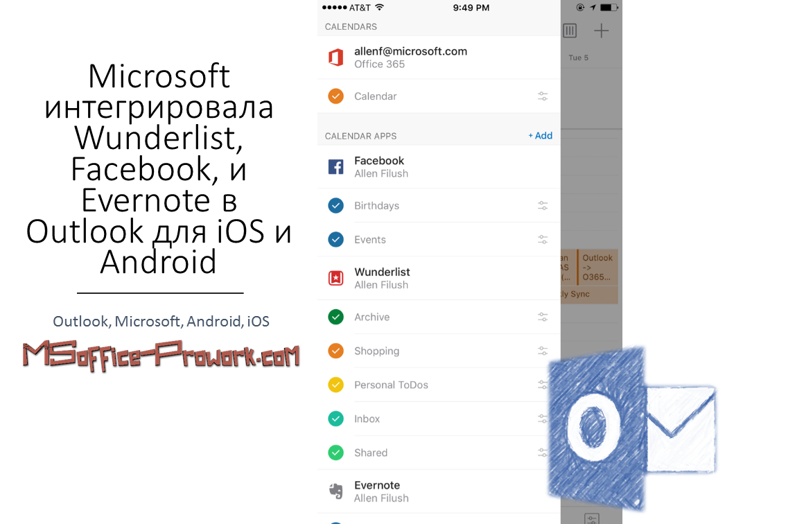 Пользователи, предпочитающие мобильные операционные системы Android и iOS, теперь смогут добавить аккаунты Wunderlist, Facebook и Evernote. Это позволит просматривать задачи, события и заметки прямо из приложения Outlook, а поскольку вся информация сосредоточена в одном органайзере, то планирование своего времени будет более эффективным.