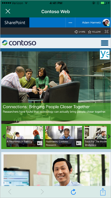 Мобильное приложение SharePoint позволяет выполнять множество действий: быстрый доступ к сайтам подразделений, порталу организации, ресурсам или просматривать над какими документами работают ваши сотрудники. Приложение использует возможности Microsoft Graph, поэтому, на основе изучения вашей активности, приложение предложит релевантные документы.