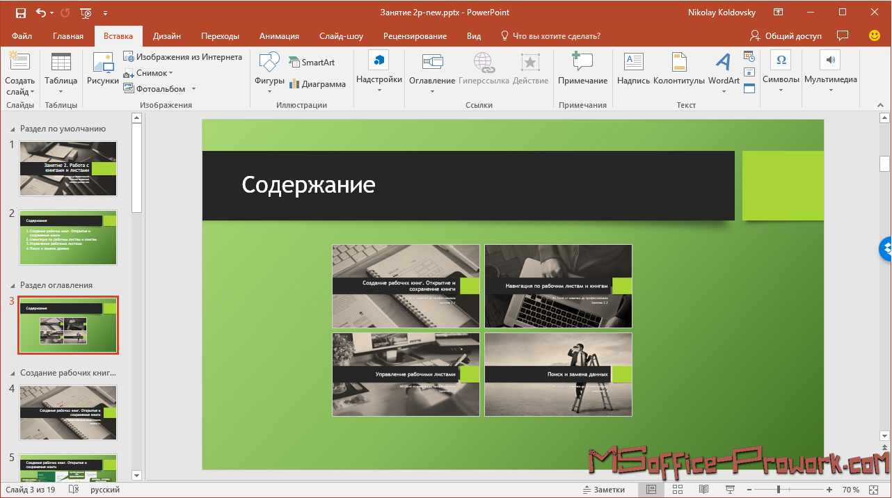 В завершение сборная презентация первых бесплатных шести занятий курса MS Excel от новичка до профессионала с добавлением эффектов перехода между заглавными слайдами и оглавлениями разделов.
