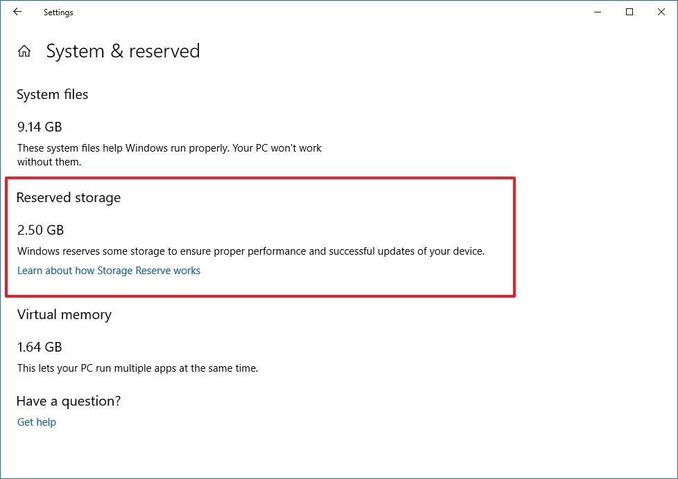 Начиная с апрельского обновления 2019 г., версии 1903 Windows 10, Microsoft предлагает ознакомиться с новой функцией зарезервированного хранилища, которая выделает часть доступного места на диске для устранения проблем установки новой версии операционной системы или обновлений по причине нехватки дискового пространства.