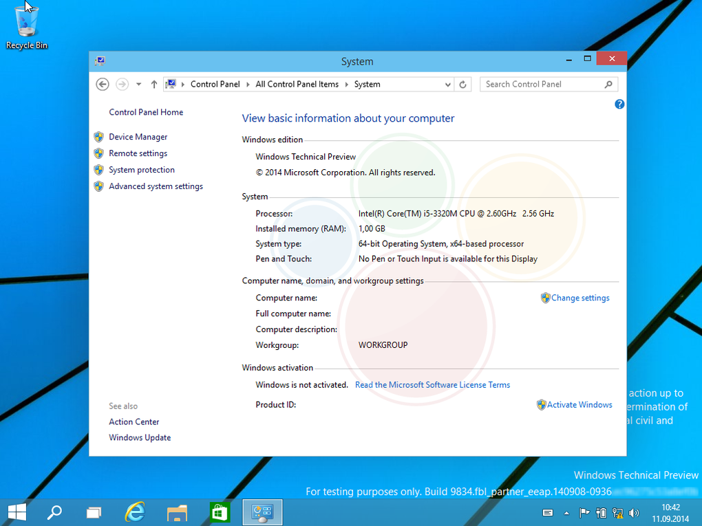 Интересную информацию можно почерпнуть из системных настроек Windows 9, так, название система носит «Windows Technical Preview», никакого упоминания о 9й версии Windows, как и нет ее кодового названия – Threshold.