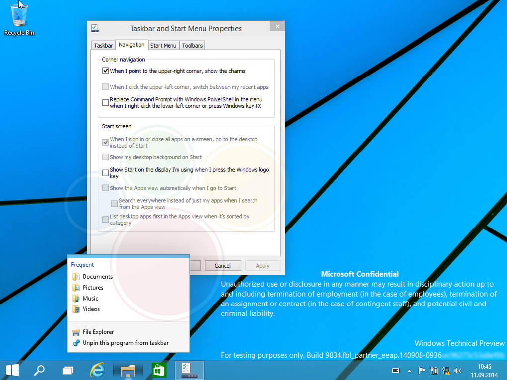 Свойства панели задач не претерпели изменений, а вот внешний вид так называемого «jump menu» немного отличается от такового в Windows 8.1.